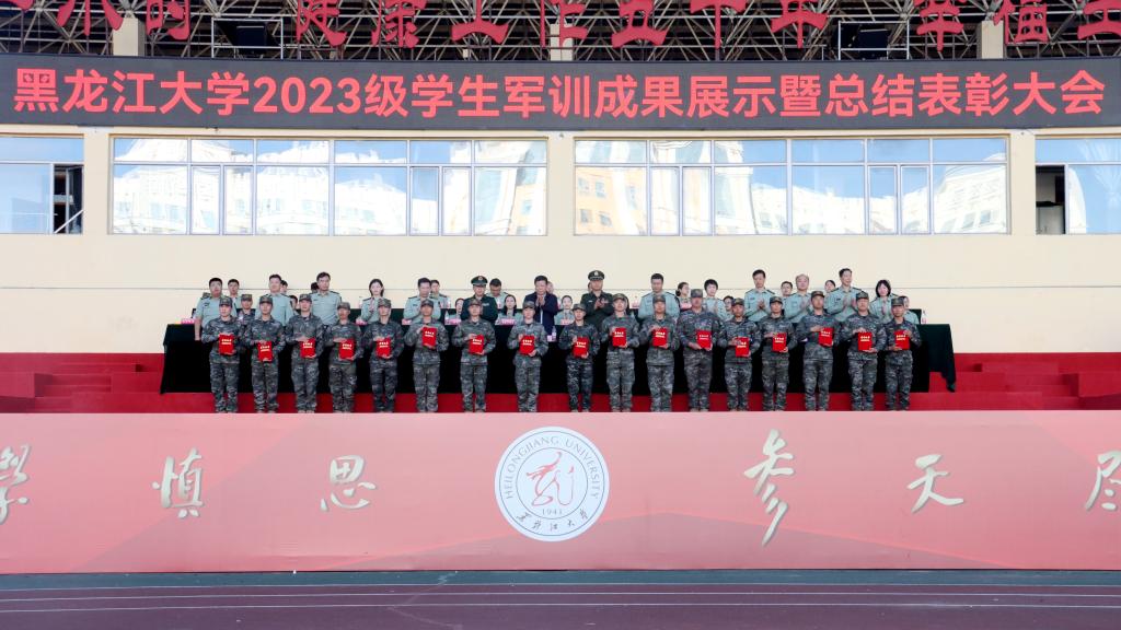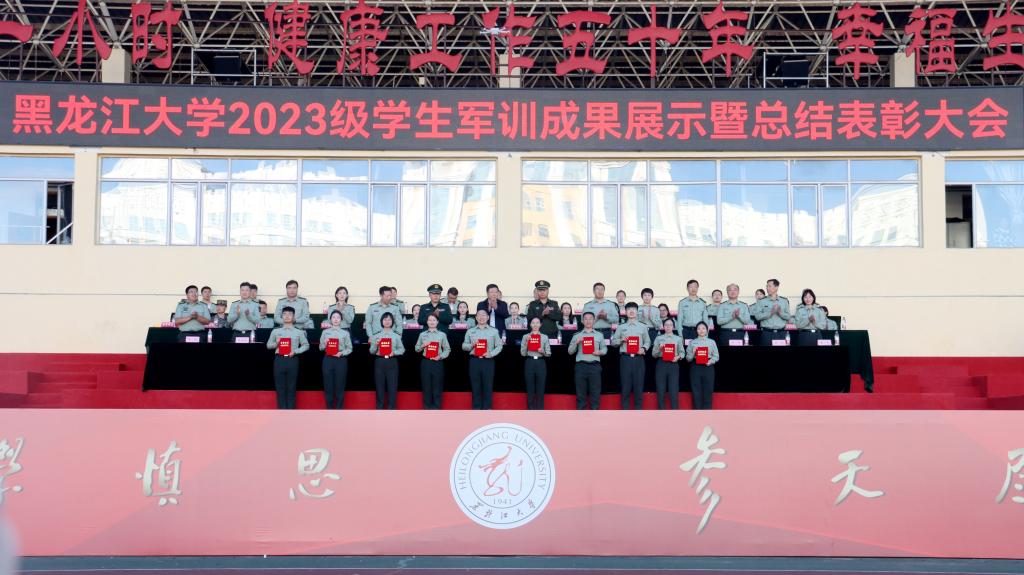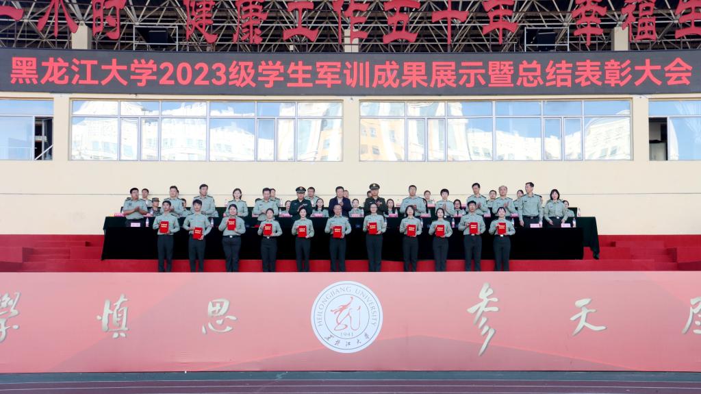 校團委書記、軍訓師政治部副主任張丹宣讀了黑龍江大學2023級學生軍訓文體活動比賽成績。校黨委常委、宣傳部部長、軍訓師政治部主任楊其濱宣讀了《關于表彰黑龍江大學2023級學生軍訓先進集體和先進個人的決定》。與會領導為獲獎集體和個人頒獎。
