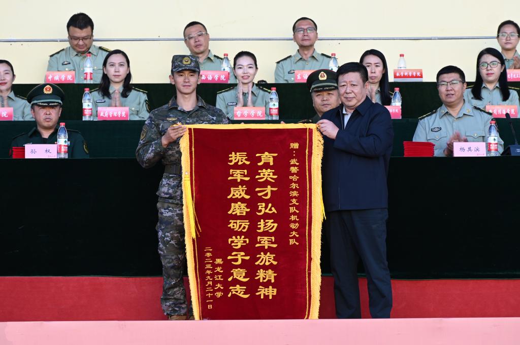 王永清代表學校向承訓單位武警哈爾濱支隊機動大隊贈送了錦旗。