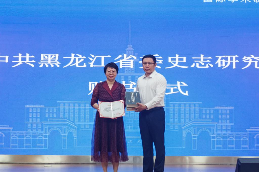 王敬波為中共黑龍江省委史志研究室省情信息處處長房波頒發(fā)捐贈證書。