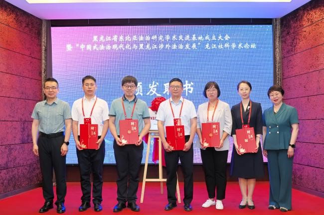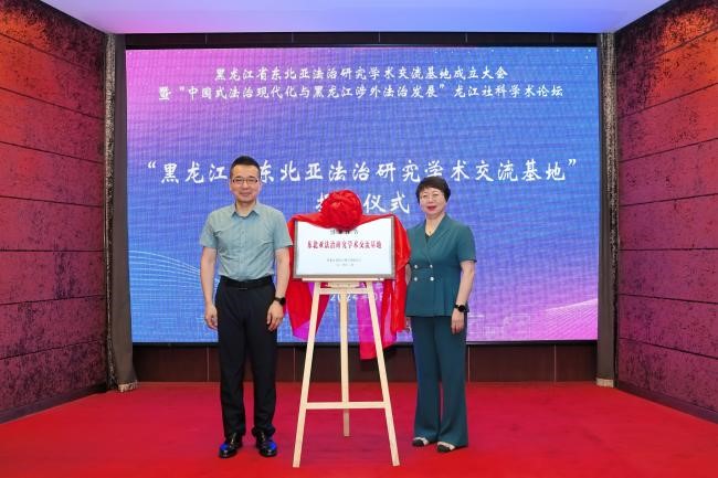 黑龍江大學校長王敬波、黑龍江省社科聯副主席王宏宇為“黑龍江省東北亞法治研究學術交流基地”揭牌。