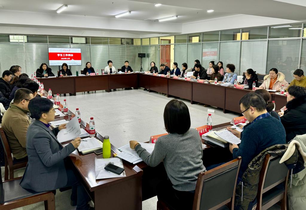 會議首先對十二月學生工作進行安排部署。校團委書記李可寶對團員和青年主題教育、紀念一二·九系列活動、優秀專職團干部評選、學生會工作考核、亞冬會志愿者招募等工作進行了部署。招生就業指導中心主任陳寶鳳重點強調了2024屆畢業生全員包保和重點群體幫扶、持續開展2023年”宏志助航計劃“全國高校畢業生就業能力培訓、大學生職業規劃大賽等工作。正處級輔導員李巾英布置了艾滋病預防教育宣傳月活動、大學生心理健康教育課程教學、朋輩心理輔導選課等工作,并強調要強化對重點學生群體的人文關懷與心理疏導,扎實做好心理危機預防與干預。學生工作部部長劉鳳影重點布置了學生安全穩定工作,要求各學院進一步做好學生意識形態工作和民族宗教工作,常態化做好安全隱患排查,加強學生安全教育,嚴格學生日常管理,扎實開展好“遵紀守法 文明修身”主題教育月系列活動。同時,詳細布置了期末考風考紀教育、“五好”寢室評選表彰等學風建設工作,梳理了學生日常思想教育、學籍管理、公寓管理、學生資助、大學生征兵、輔導員隊伍建設等相關工作任務和工作要求。