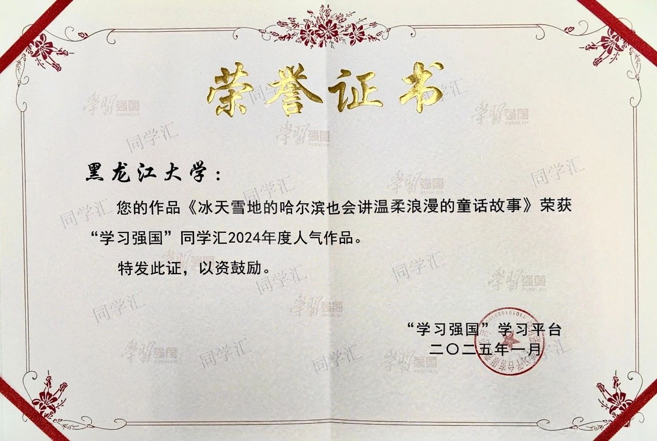 近日,“學(xué)習(xí)強(qiáng)國”學(xué)習(xí)平臺公布了“學(xué)習(xí)強(qiáng)國”同學(xué)匯2024年度人氣作品(高校)Top100、2024年度人氣作品(個人)Top100、2024年度高校融媒團(tuán)隊Top50名單。我校被評為2024年度“學(xué)習(xí)強(qiáng)國”同學(xué)匯最具傳播力高校,我校全媒體中心被評為2024年度高校融媒團(tuán)隊Top50,《冰天雪地的哈爾濱也會講溫柔浪漫的童話故事》榮獲“學(xué)習(xí)強(qiáng)國”同學(xué)匯2024年度人氣作品。