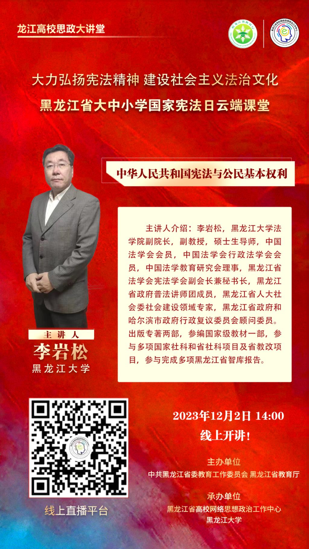 為深入學習貫徹習近平新時代中國特色社會主義思想,深入學習宣傳習近平法治思想,大力弘揚憲法精神,中共黑龍江省委教育工作委員會、黑龍江省教育廳委托黑龍江省高校網絡思想政治工作中心舉辦“大力弘揚憲法精神 建設社會主義法治文化黑龍江省大中小學國家憲法日云端課堂”學習憲法活動,以云端龍江思政大講堂的方式,加強教育引導,全面落實普法責任,具體預告如下: