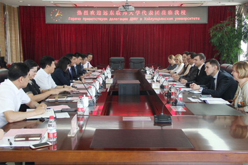 6月14日下午,俄羅斯遠東聯邦大學代表團在代理校長N.Y.阿尼西莫夫的帶領下來我校參觀訪問。代表團首先在嚴明副校長的陪同下參觀了校史館,隨后雙方在主樓八樓會議室就如何加強合作舉行了會談。參加會談的有我校黨委書記劉德權、副校長嚴明,以及國際合作與交流處、研究生學院、俄羅斯語言文學與文化研究中心、中俄學院、教務處、俄語學院的主要領導。