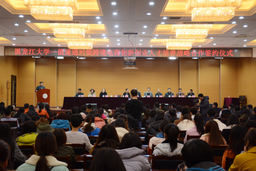 11月11日下午,我校與俄速通對俄跨境電商創(chuàng)新創(chuàng)業(yè)人才培養(yǎng)戰(zhàn)略合作簽約揭牌儀式在主樓一樓報(bào)告廳舉行。這是我省高校首次與跨境電商企業(yè)進(jìn)行跨境電商領(lǐng)域的合作,在訂單式聯(lián)合培養(yǎng)的模式下,為企業(yè)輸送特定專業(yè)人才。省教育廳副廳長趙琳、省商務(wù)廳副廳長趙武君、我校校長何穎、俄速通首席執(zhí)行總裁于航等十余名來自省、校以及企業(yè)領(lǐng)導(dǎo)出席此次儀式。我校經(jīng)濟(jì)與工商管理學(xué)院書記常樹春主持儀式。我校師生代表參加此次儀式。