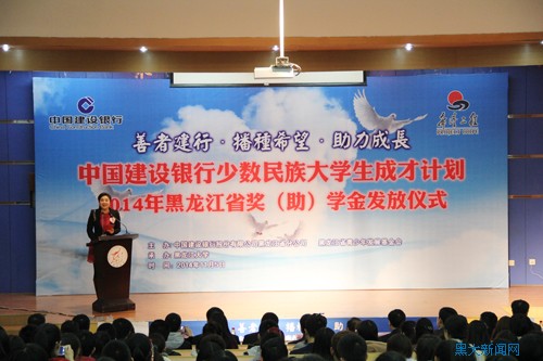11月5日上午,中國建設(shè)銀行少數(shù)民族大學(xué)生成才計劃——2014年黑龍江省獎(助)學(xué)金發(fā)放儀式在我校陽光講壇舉行。共青團黑龍江省委副書記關(guān)威,中國建設(shè)銀行股份有限公司黑龍江省分行黨委副書記、副行長耿慶軍,哈爾濱工程大學(xué)黨委副書記、副校長魏潾,東北林業(yè)大學(xué)黨委副書記藺海波,黑龍江大學(xué)黨委副書記曲科軍,黑龍江省青少年發(fā)展基金會秘書長楊晶,黑龍江省建行相關(guān)領(lǐng)導(dǎo)及來自哈爾濱工程大學(xué)、東北林業(yè)大學(xué)、黑龍江大學(xué)獲得該項獎學(xué)金的受助生與黑龍江大學(xué)的學(xué)生代表參加了本次頒發(fā)儀式。儀式由省電臺主持人修琳主持。