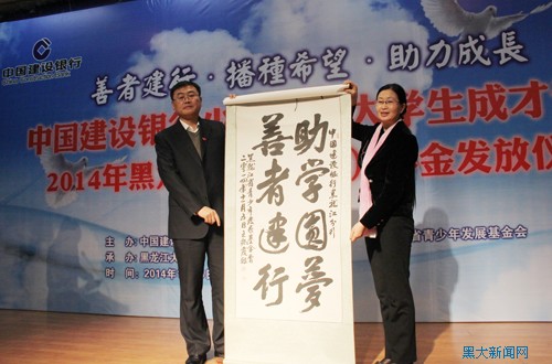 受助學(xué)子代表向中國建設(shè)銀行股份有限公司黑龍江省分行贈送自己精心準(zhǔn)備的手工藝品,以感謝中國建設(shè)銀行的愛心善舉。楊晶秘書長代表黑龍江省青少年發(fā)展基金會把寫有“助學(xué)圓夢,善者建行”的書法作品贈予中國建設(shè)銀行股份有限公司黑龍江省分行。隨后,分別畢業(yè)于哈爾濱工程大學(xué)、東北林業(yè)大學(xué)、黑龍江大學(xué)的受助學(xué)生代表何志芳、馮俊瑛、張興寶分享成長故事,講述自己心存感恩、關(guān)愛他人、奉獻社會的人生經(jīng)歷。