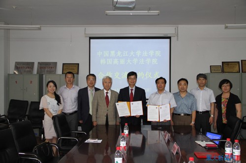 6月5日,黑龍江大學法學院與韓國高麗大學法學院交流合作框架協議簽字儀式在匯文樓835會議室舉行,韓國高麗大學法學院院長申榮鎬及鄭永煥教授、鄭燦亨教授,我校法學院領導班子及師生代表參加了簽約儀式。