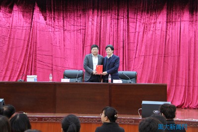 4月17日上午,“聘任中國旅游研究院戴斌院長為黑龍江大學兼職教授儀式暨中俄人文合作協同創新中心學術報告會”在學校主樓C座一樓報告廳隆重召開。我校副校長丁立群出席會議并為戴斌教授頒發黑龍江大學兼職教授聘書。