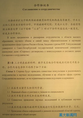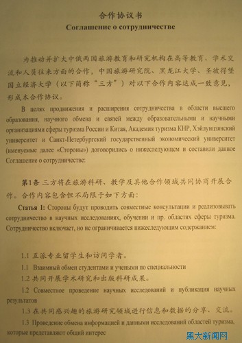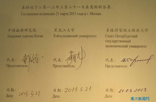 在俄羅斯“中國旅游年”開幕之際,中國旅游研究院、黑龍江大學(xué)和彼得堡國立經(jīng)濟大學(xué)在莫斯科簽署加強旅游研究與交流的合作協(xié)議。簽字儀式于3月21日18時在莫斯科俄聯(lián)邦政府大樓舉行,國務(wù)院副總理、俄中旅游年中方組委會主席汪洋,俄聯(lián)邦副總理、俄中旅游年俄方組委會主席奧列加?戈羅杰茨等出席簽字儀式。中國旅游研究院院長戴斌,黑龍江大學(xué)校長、中俄人文合作協(xié)同創(chuàng)新中心主任張政文的授權(quán)代表李亞龍和俄羅斯圣彼得堡國立經(jīng)濟大學(xué)副校長阿?耶?卡爾里克分別在協(xié)議上簽字。