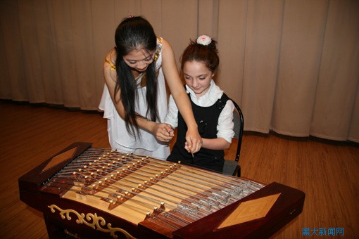 團員向俄羅斯小姑娘講解揚琴并示范演奏