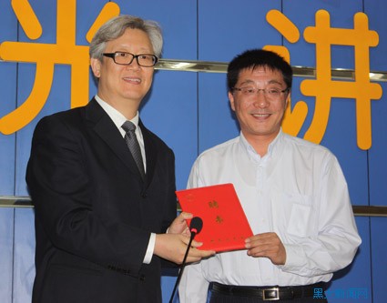 我校校長(zhǎng)張政文向吳建中館長(zhǎng)頒發(fā)黑龍江大學(xué)客座教授聘書(shū)